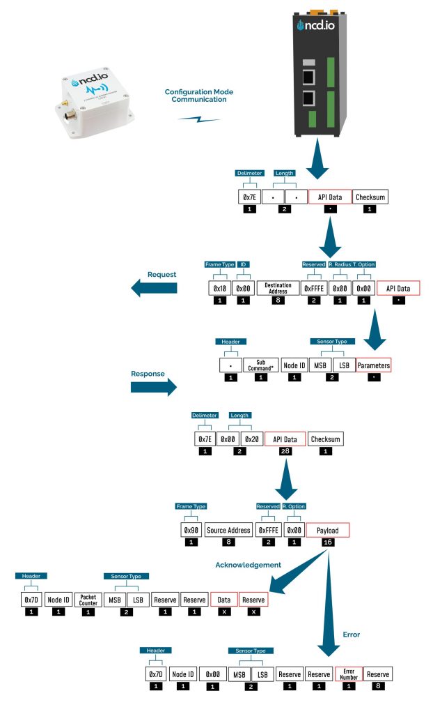 Run mode is the default mode of operation of this sensor. In this mode, the sensor sends periodic packets with the sensor measurement data. During the time it is not sending it enters deep-sleep to conserve power. The sensor’s X-bee module operates in API mode and sends packets to the saved destination address on the network specified by the saved PAN ID. Figure 4 illustrates the API transmission/reception procedure.