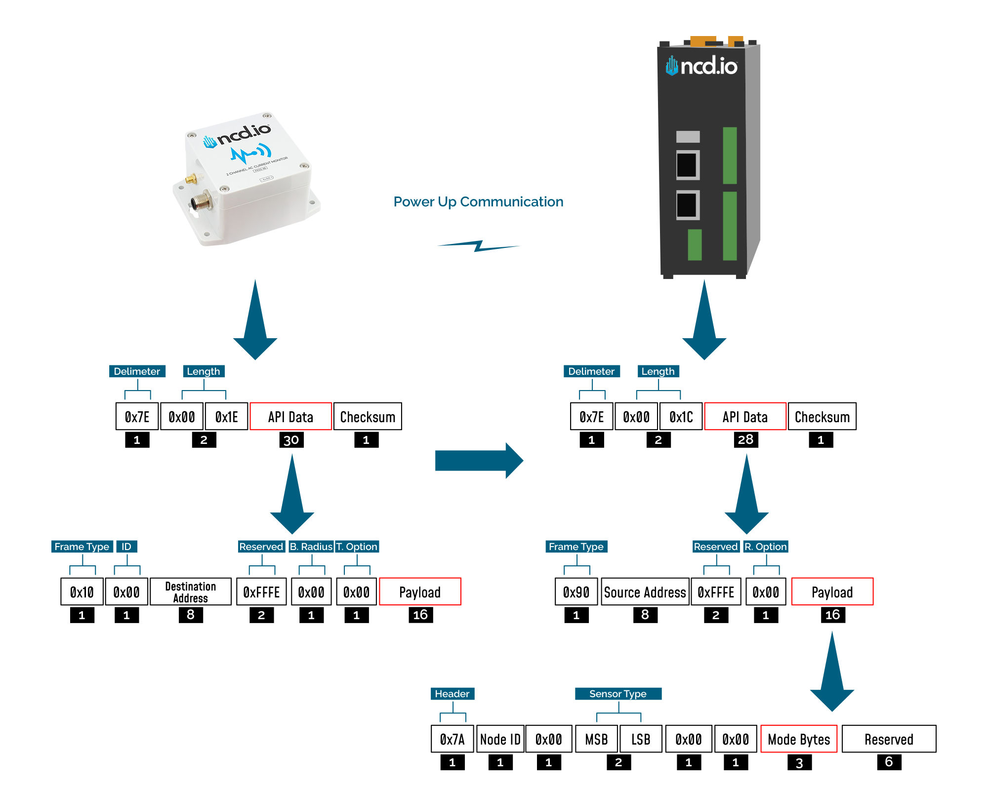 | 7E 00 1C 90 00 13 A1 00 41 58 1C CB FF FE 00 7A 01 00 00 01 00 00 52 55 4E 00 00 00 00 00 00 0B | Example frame | |