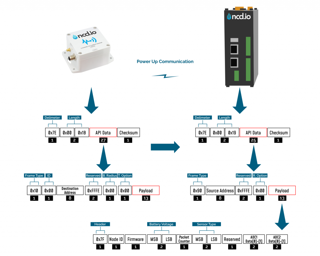 Figure 3 provides an outline of the frame structure at Power Up, where the bytes highlighted in Red denote which mode the device has started in (Run, Configuration or Factory Default). You can look up the corresponding codes in Table 2.
