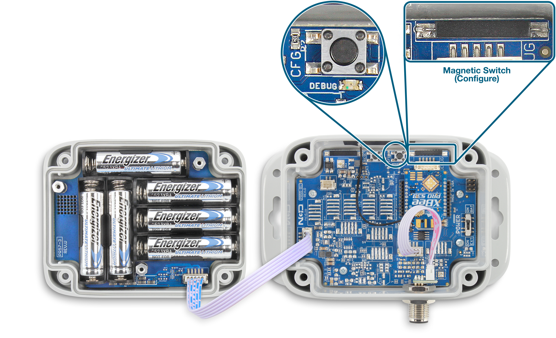 The second is to test for the presence of power on the sensor. If the CFG button is pressed the TEST LED on the board will light up indicating that the board has power. If no LED comes on check that the Power Switch is in the correct position and that the battery/power supply is good.