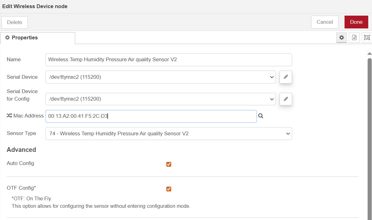 Any sensor put into configuration mode through the use of the Reset and CFG buttons will be seen by the gateway while in this mode. If Node-Red has a corresponding Wireless Device node for the sensor reporting in then Node-Red will begin configuring that sensor if set to do so. You can enter Config mode or leave Config mode to resume Normal Operations using the button on the left side of the node.