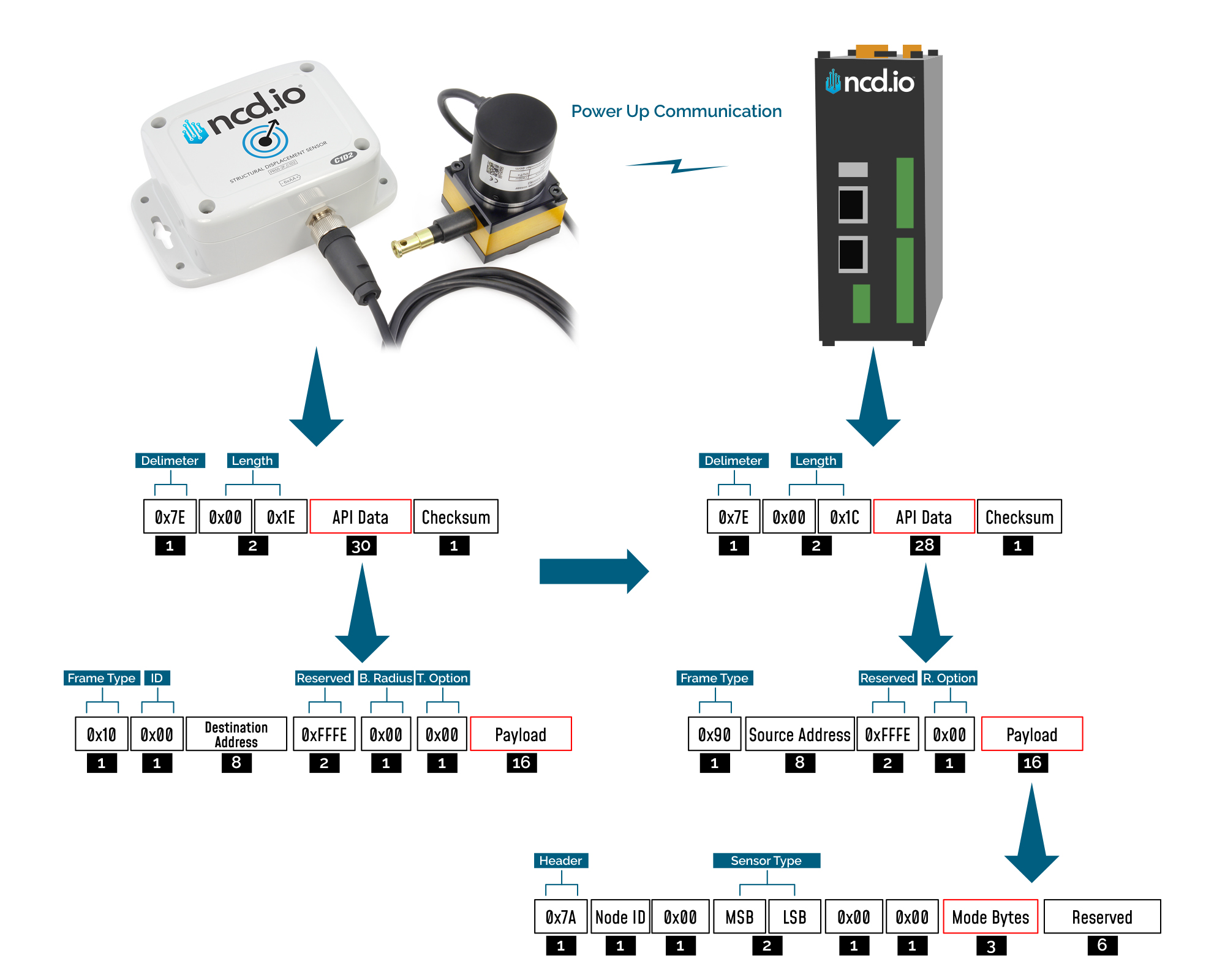 Figure 3 provides an outline of the frame structure at Power Up, where the bytes highlighted in Red denote which mode the device has started in (Run, Configuration or Factory Default). You can look up the corresponding codes in Table 2.