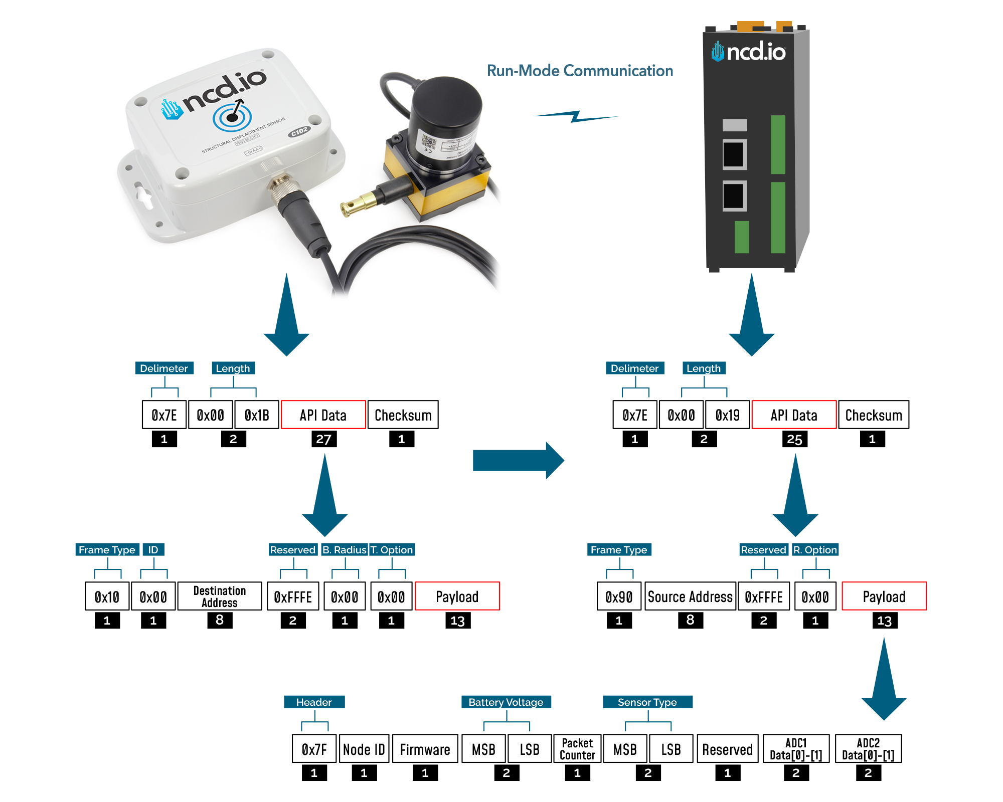 Run mode is the default mode of operation of this sensor. In this mode, the sensor sends periodic packets with the sensor measurement data. During the time it is not sending it enters deep-sleep to conserve power. The sensor’s X-bee module operates in API mode and sends packets to the saved destination address on the network specified by the saved PAN ID. Figure 4 illustrates the API transmission/reception procedure.