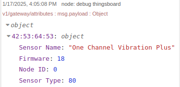 This message contains the real-time sensor data, which includes key readings such as temperature, vibration, and battery percentage. The flow formats this data and publishes it to ThingsBoard as telemetry data. Telemetry data in ThingsBoard is used for real-time monitoring and visualization, enabling users to track the sensor’s status and performance over time.
