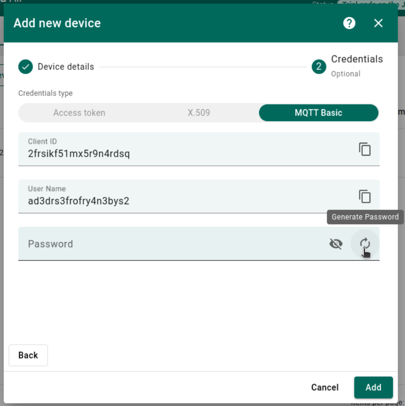 Once the credentials are generated, use the ‘Copy’ button to retrieve each value. We recommend saving these values in a temporary file, as we will use them in the Node-RED MQTT node later in this tutorial. Next, click the ‘Add’ button.