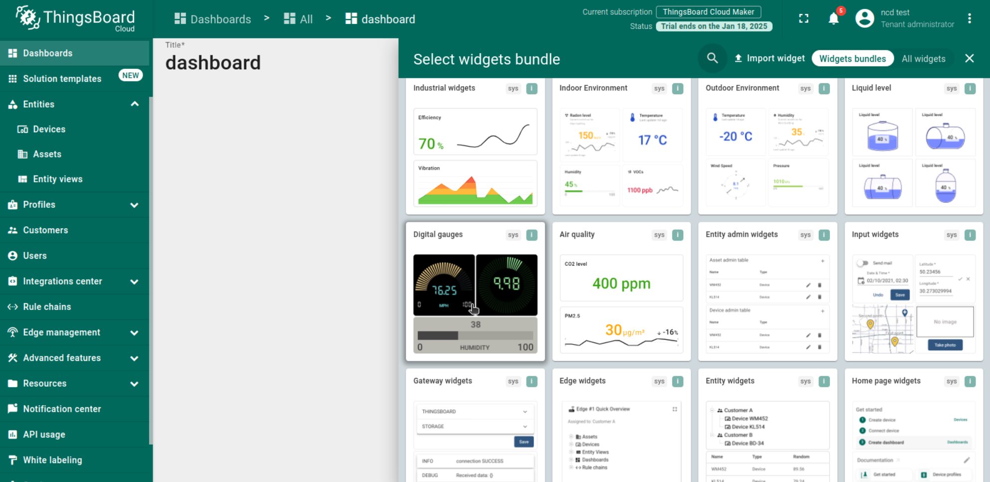 The next step is to create a ThingsBoard dashboard. A dashboard in ThingsBoard allows users to visualize and monitor data collected from IoT devices. Let’s create a dashboard and add some widgets to display a list of entities and their latest NCD Sensor values. To create a new, empty dashboard, follow these steps.