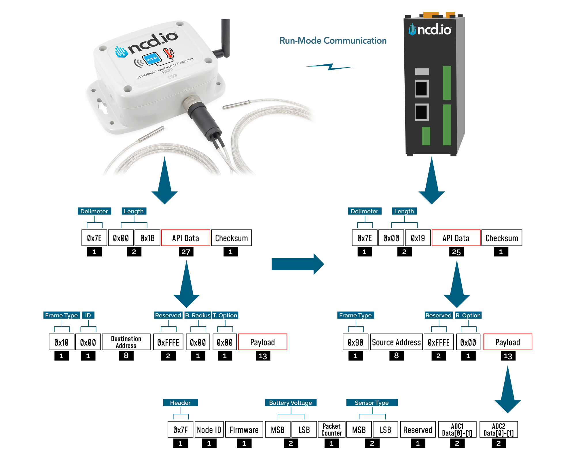 | 7E 00 1C 90 00 13 A1 00 41 58 1C CB FF FE 00 7A 01 00 00 01 00 00 52 55 4E 00 00 00 00 00 00 0B | Example frame | |