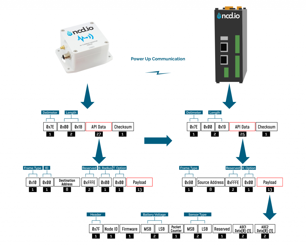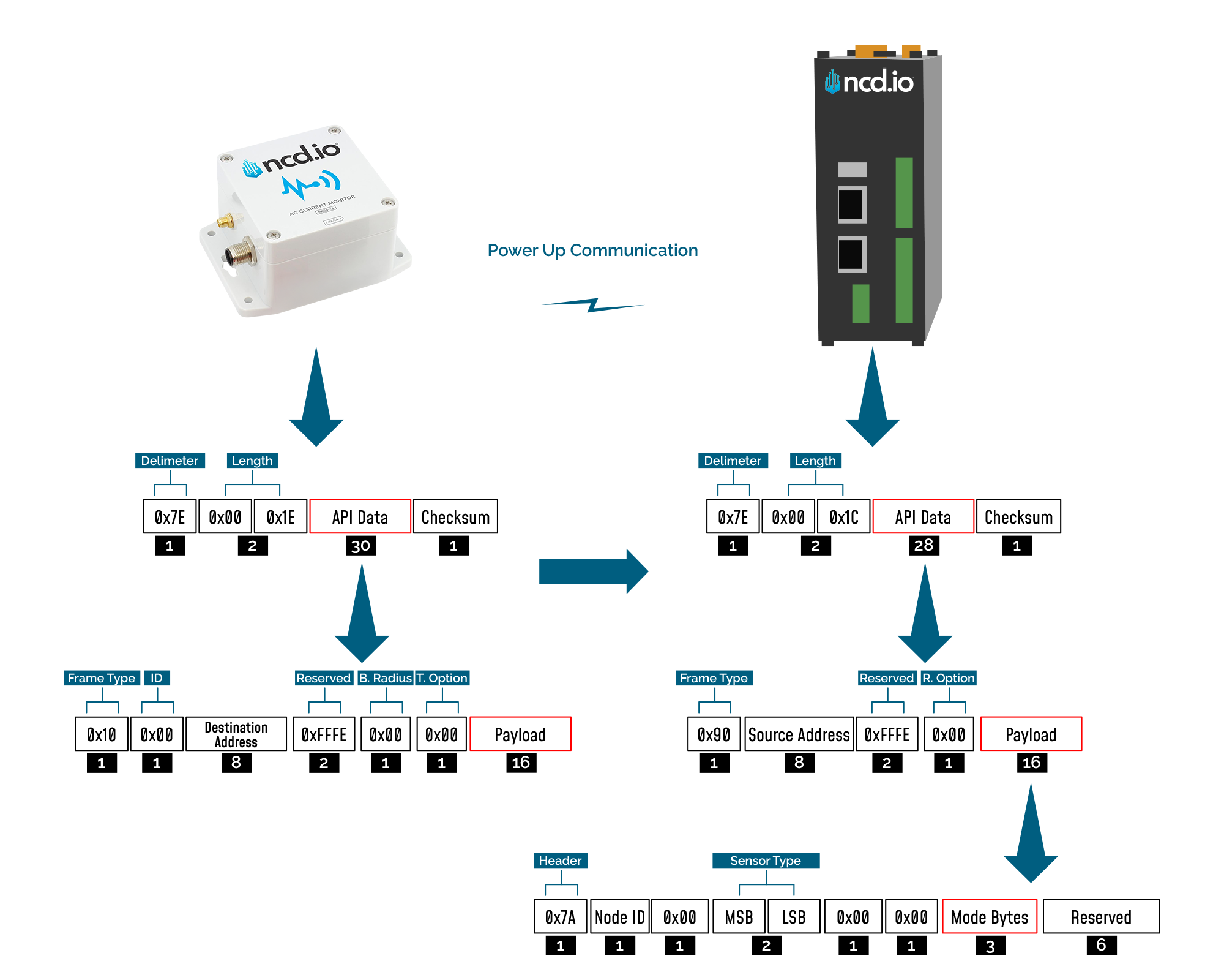 Figure 3 provides an outline of the frame structure at Power Up, where the bytes highlighted in Red denote which mode the device has started in (Run, Configuration or Factory Default). You can look up the corresponding codes in Table 2.