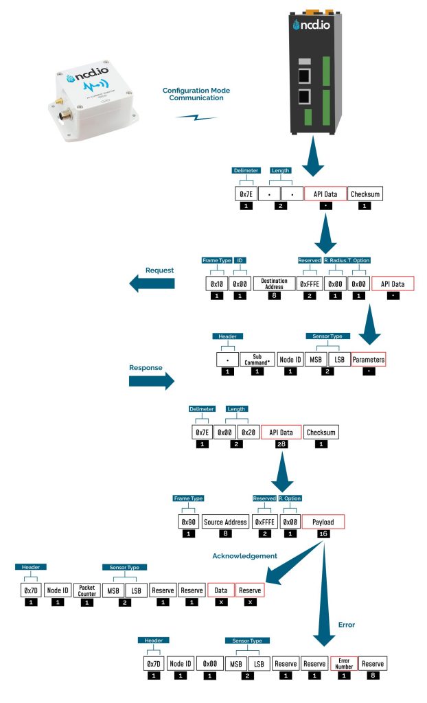 Run mode is the default mode of operation of this sensor. In this mode, the sensor sends periodic packets with the sensor measurement data. During the time it is not sending it enters deep-sleep to conserve power. The sensor’s X-bee module operates in API mode and sends packets to the saved destination address on the network specified by the saved PAN ID. Figure 4 illustrates the API transmission/reception procedure.