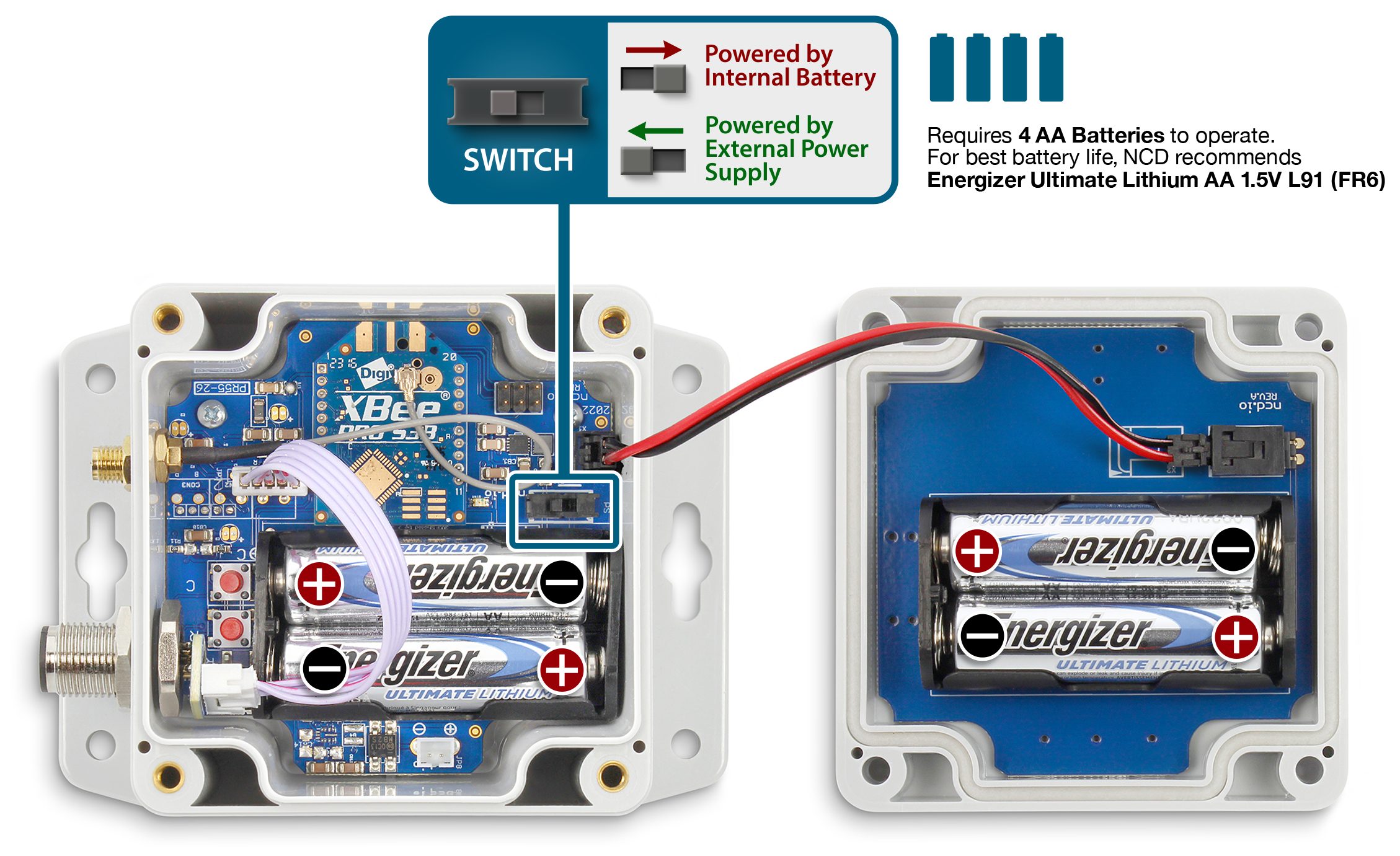 The Battery Power position will use the onboard batteries to power the sensor and transmit data.
