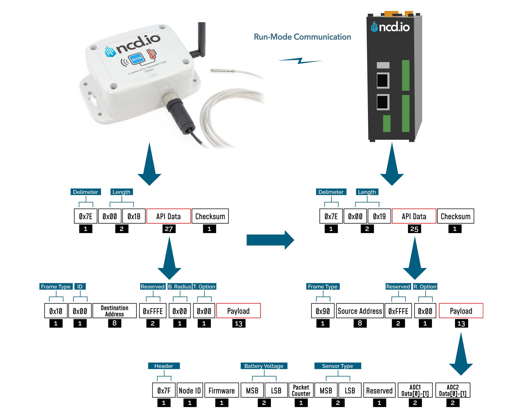 | 7E 00 1C 90 00 13 A1 00 41 58 1C CB FF FE 00 7A 01 00 00 01 00 00 52 55 4E 00 00 00 00 00 00 0B | Example frame | |