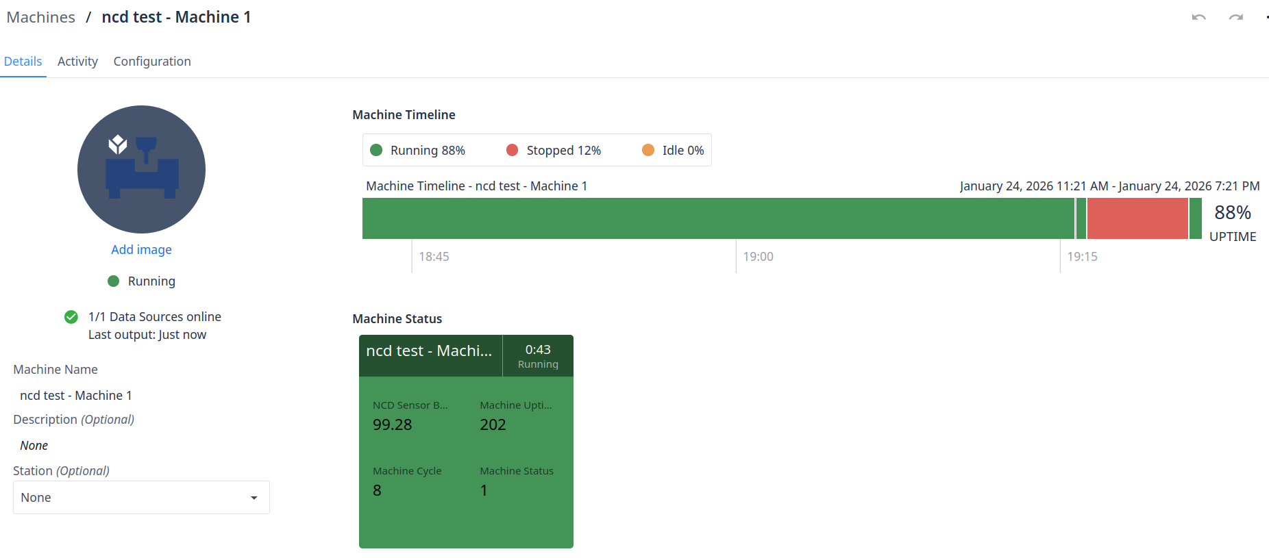 As soon as the data from the Machine Uptime Monitoring sensor is updated, the values within the Tulip platform should be updated in the next data transmission.
