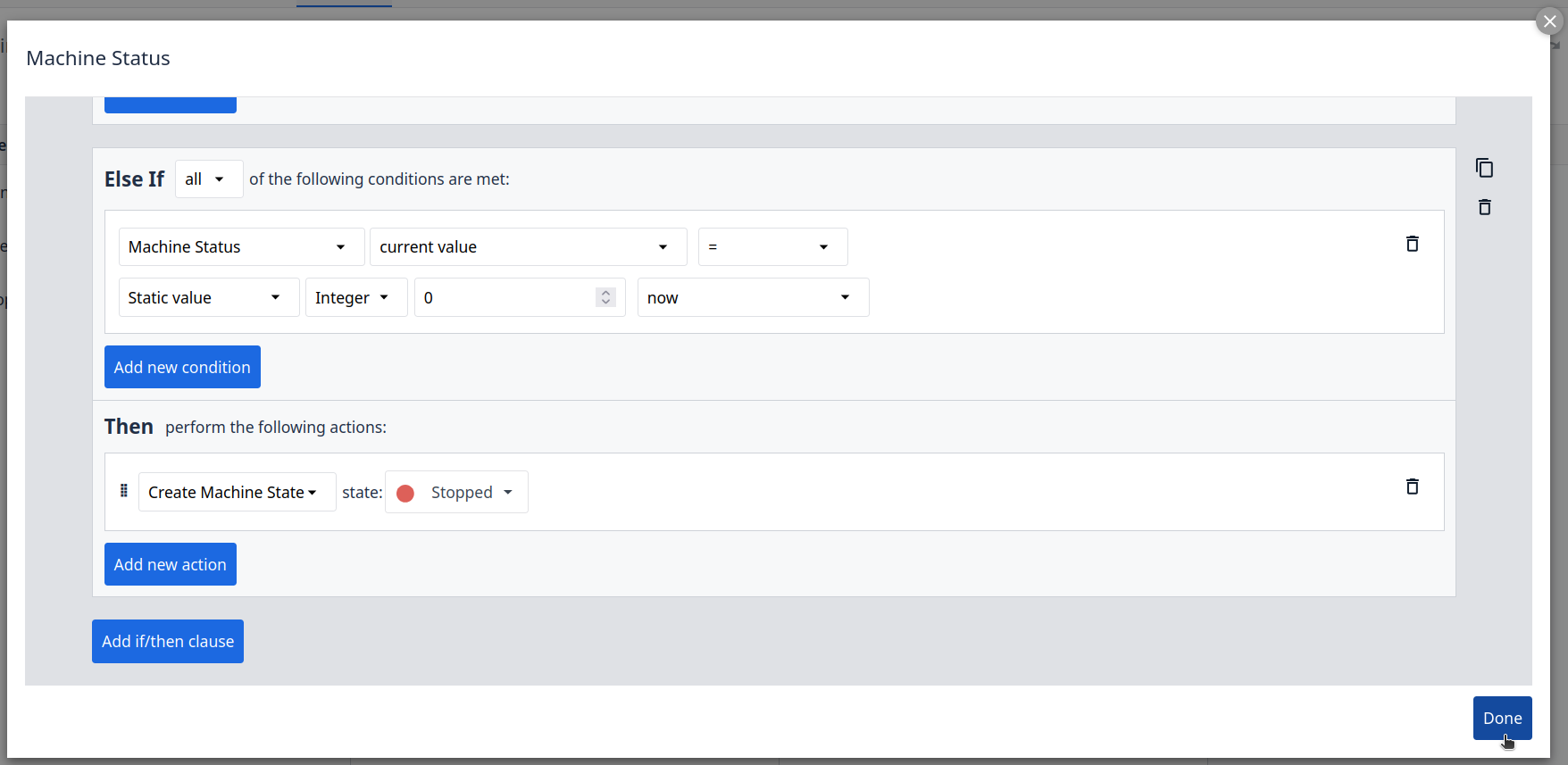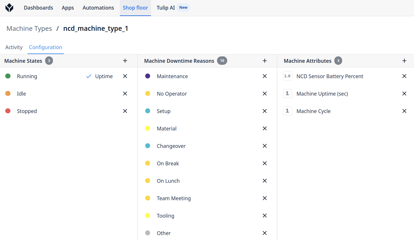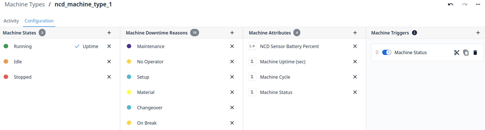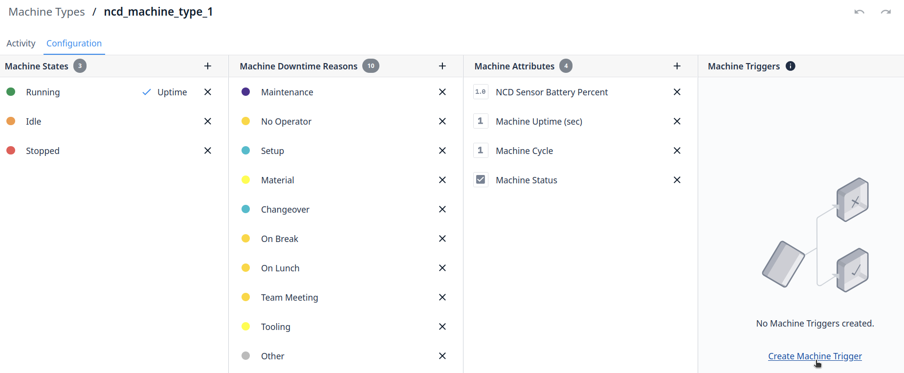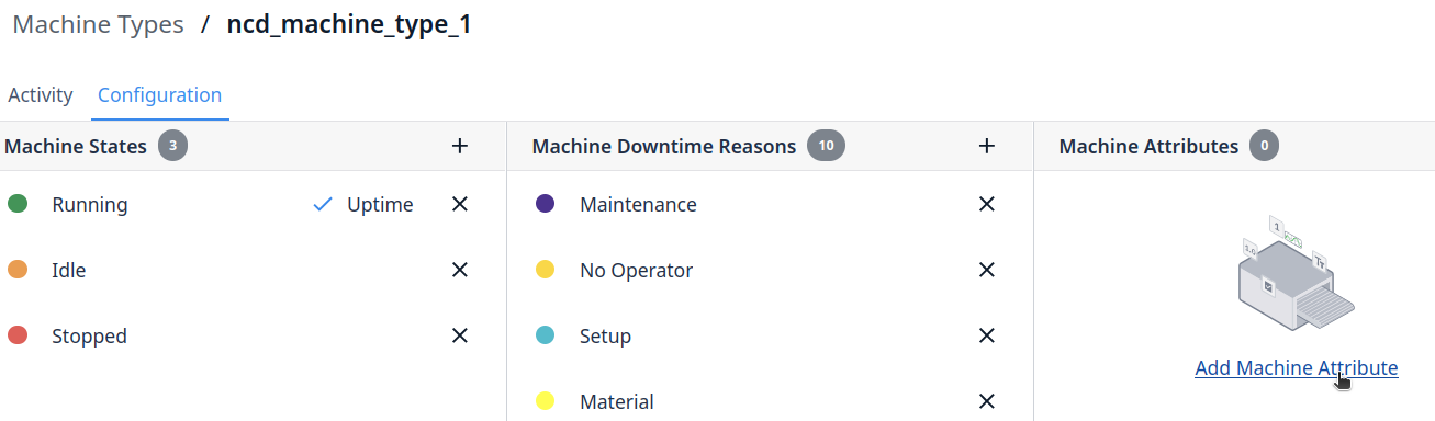 Machine Types allow you to group machines by brand or functionality. Machine States, Attributes, Downtime Reasons, and Triggers are configurable for a machine type and all machines under this machine type will inherit these.