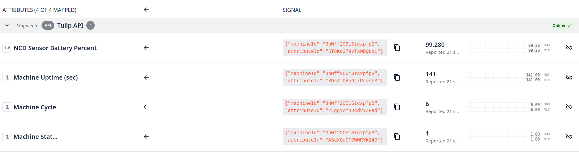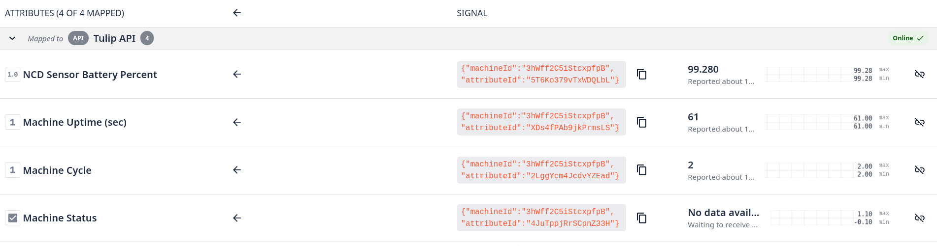 At this point, you have successfully mapped the sensor’s battery percentage, machine uptime (in seconds), machine cycles, and real-time machine status to the Tulip platform. You can now leverage Tulip’s advanced features—such as custom logic, automated alarms, data analytics, and interactive dashboards—to maximize your operational insights.