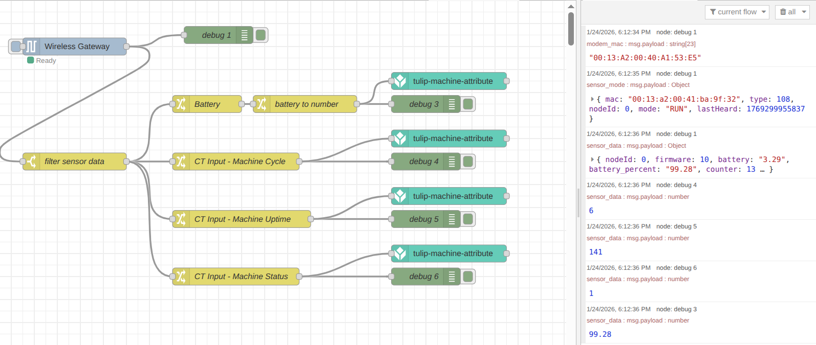Once complete, click the Deploy button to save and apply your changes. To verify the flow, you can connect a Debug node to the output of each Change node and deploy again. When the next sensor transmission occurs, you will see each data point displayed separately in the debug sidebar—exactly what is needed to send individual values to the Tulip platform.