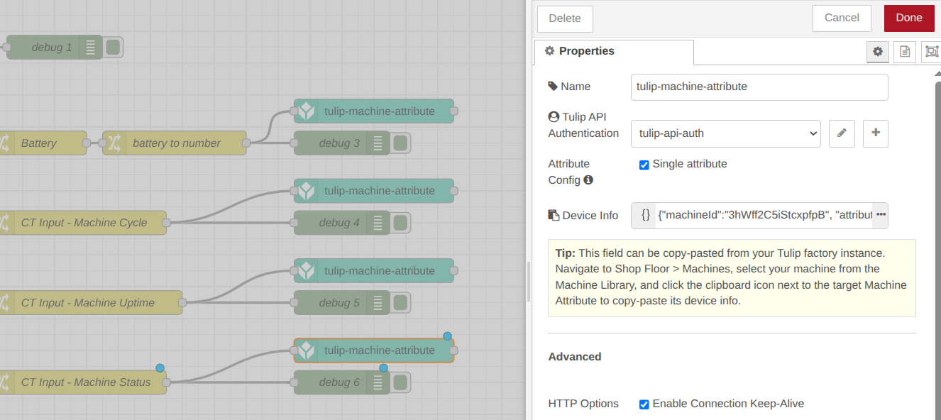 Once you have verified the connection and confirmed that data is appearing in your Tulip account, you can connect the NCD flow to your tulip-machine-attribute node to begin live data transmission. For this example, connect the output of the “CT Input – Machine Cycle” node to the “tulip-machine-attribute” node. Click the Deploy button and wait for the next sensor transmission.