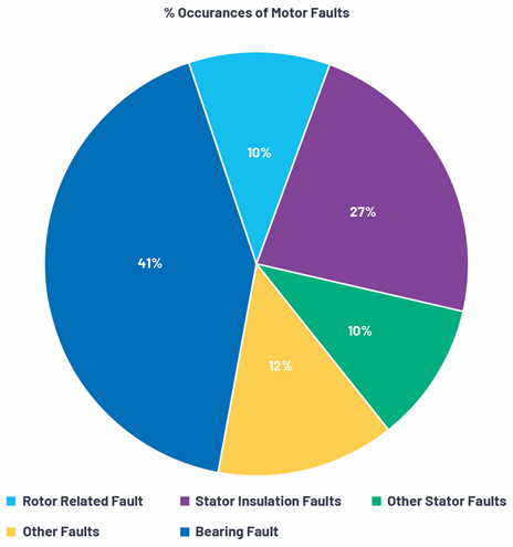 As can be seen in the Pi chart below the predominant fault in rotary machinery (contains a motor of some type) is due to issues with the bearing. Thus, we focus on this particular fault, complemented by lubrication issues (over or under) as one is related to the other.