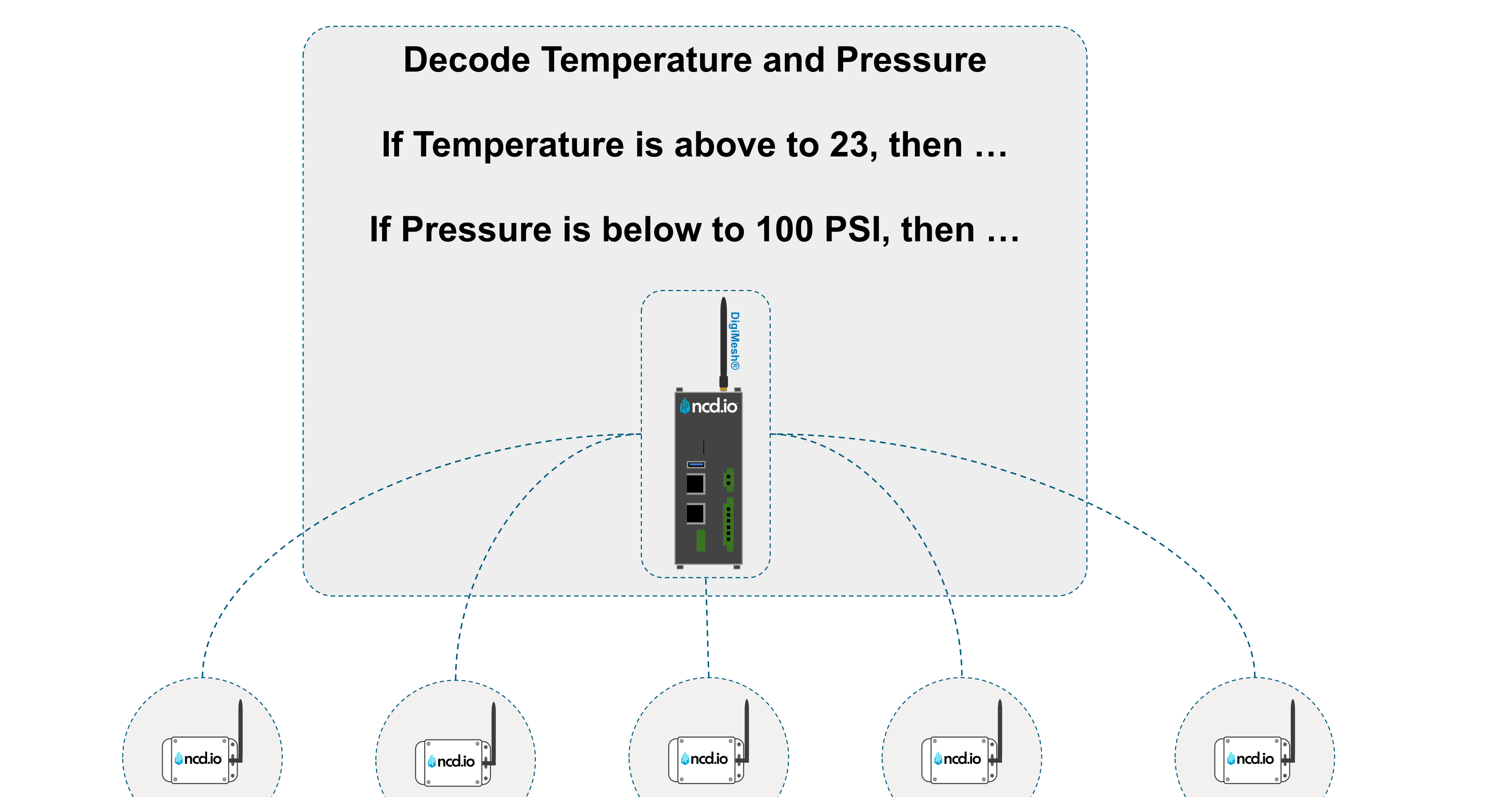 2. Edge Processing: The gateway decode and filters data value or noise (e.g., “temperature is normal”) and makes immediate decisions (e.g., “Vibration is critical! Stop machine!”).
